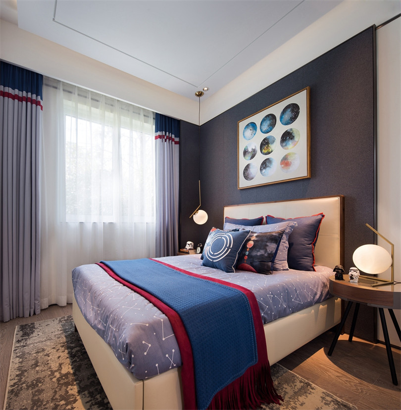 在卧室的打造上更为匠心独具,主卧以“莲”为主题,陶艺装饰在平衡而和谐的布局里别有一派隐居之气,茶具、手串等摆件无一不体现主人的简美生活情趣。老人房则充满空间诗学,衣柜镜面的山水意境画若隐若现,传达出空灵之美,更符合年迈之人的审美习性。儿童房的设计并没有一味附和潮流,而是同其他空间和谐统一,安静的色彩搭配、棋艺装饰,让孩子保持安静的情绪,同样能够品味幽玄之美,远离都市的喧嚣。