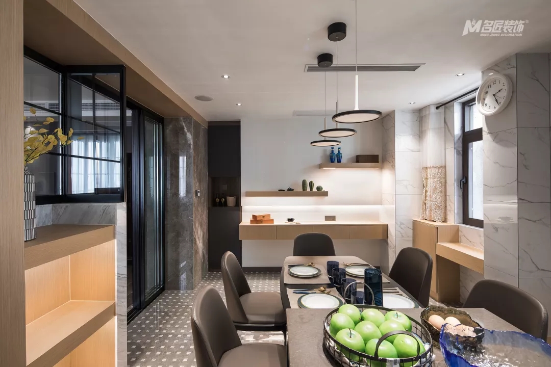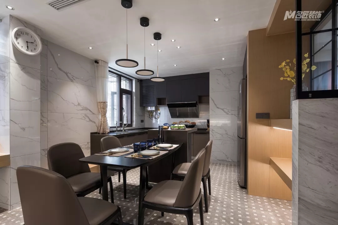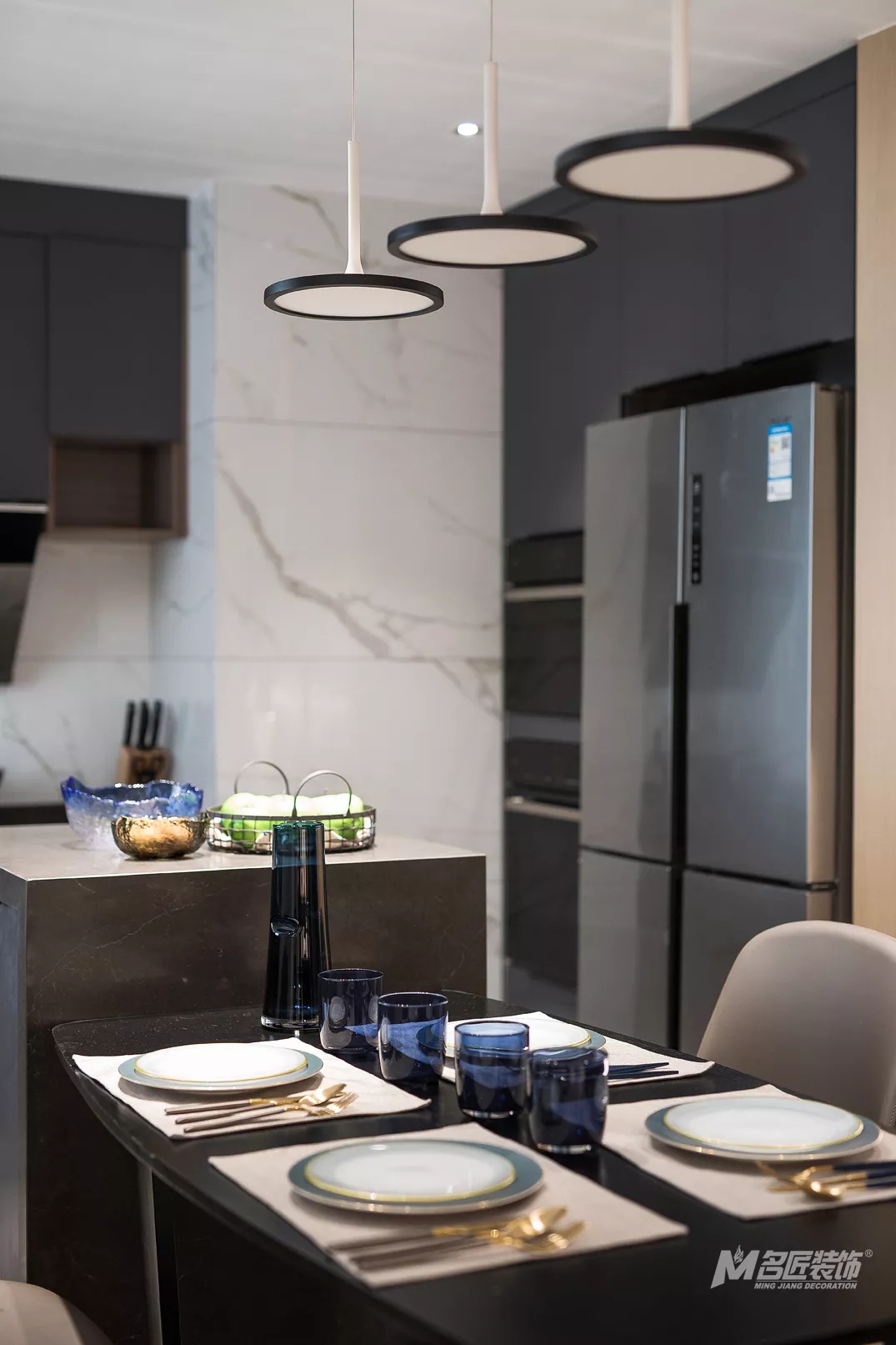 来到餐厅,也是一幅非常精致简约的画卷,黑白灰三色兼糅,营造时尚的烹饪就餐氛围。