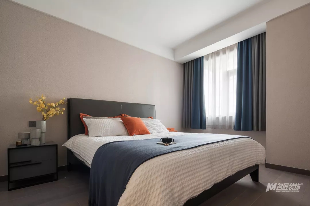 次卧又融入了烟灰蓝,与整体高级灰基调相搭配,空间更显稳重大方,精致优雅。