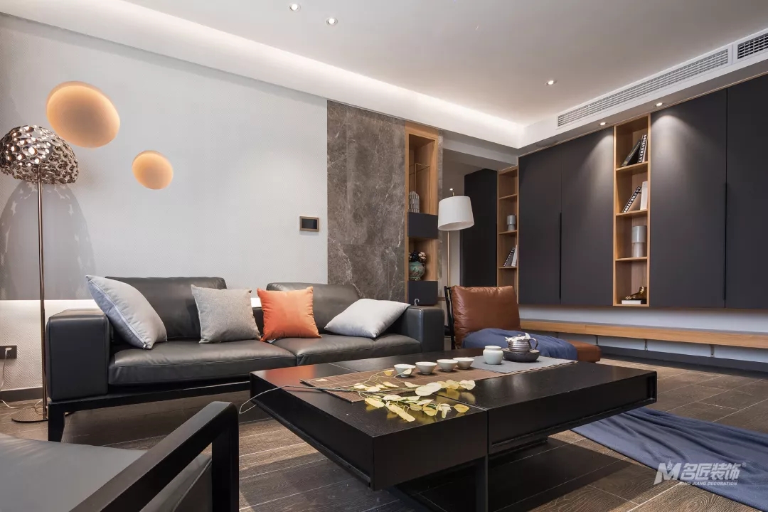 黑色的皮艺沙发与细腻的高级灰背景墙,氛围更显沉稳大气,平静祥和,瞬间让人忘记室外喧闹的世界。